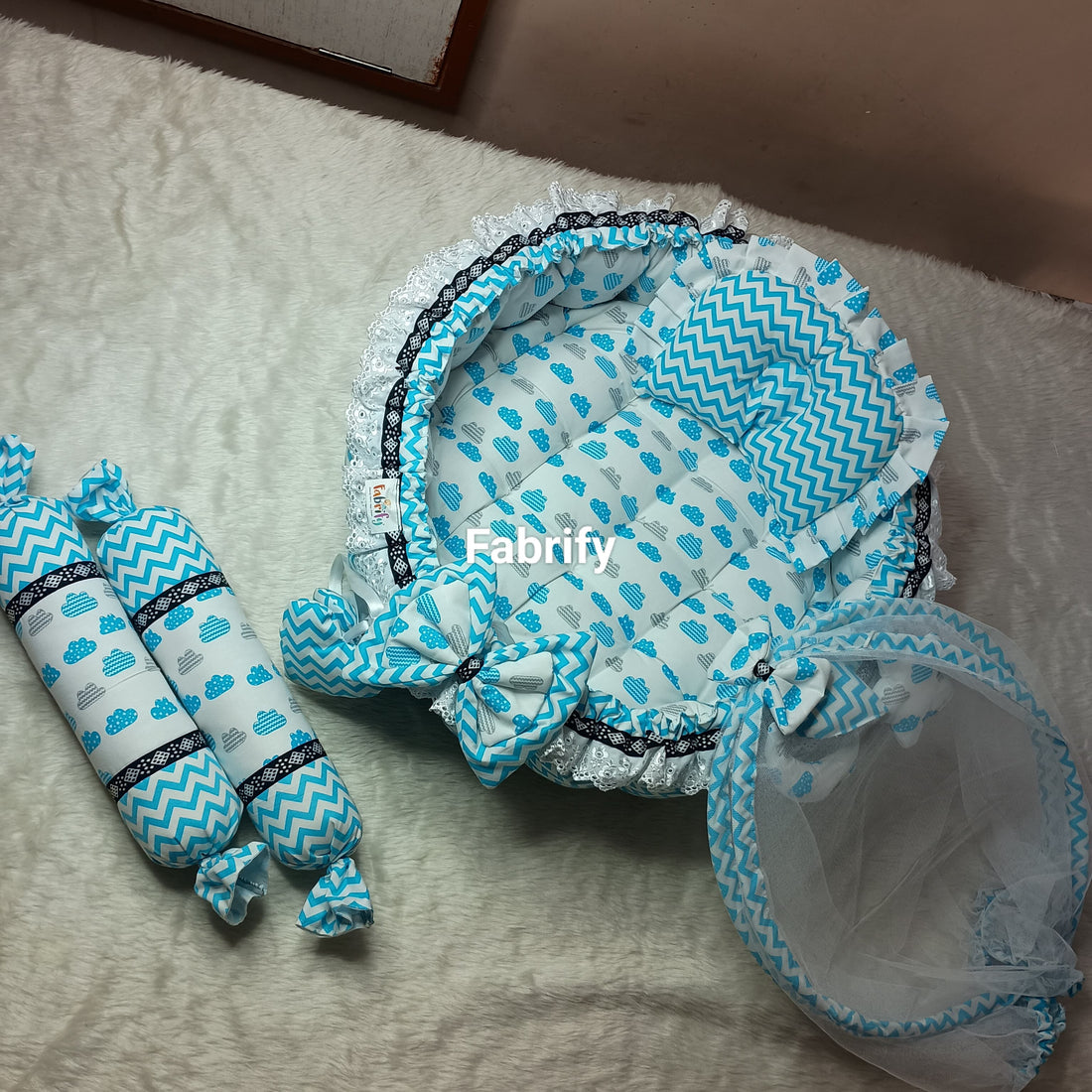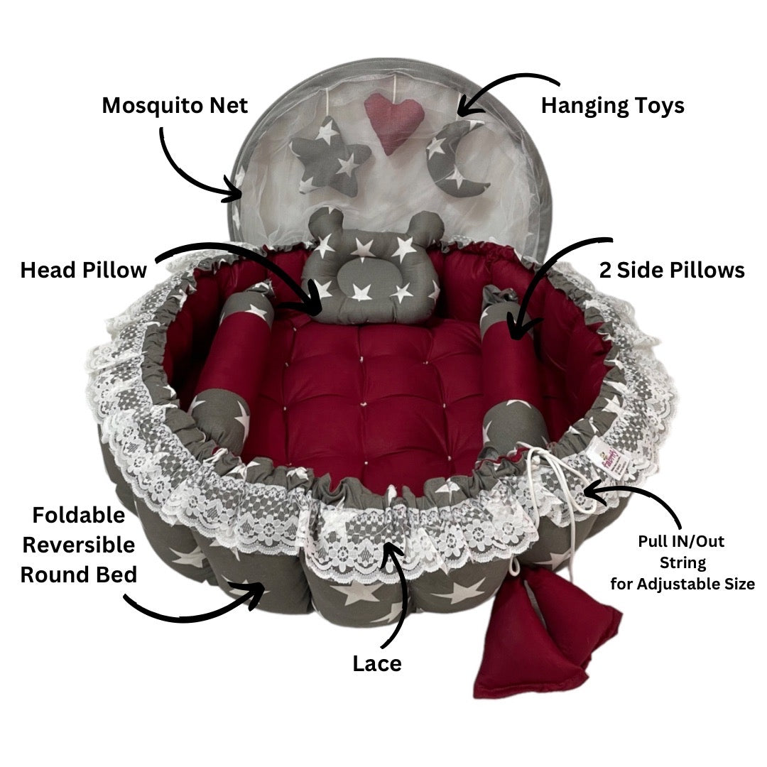 fabrify presents a collection of baby reversible round bedding set cum mattress for your newborn baby which must add to your collection which gives an elegant look to your bedroom. perfect product for baby photoshoot accessories Be sure of gifting it to a loved one as well. It is available in many different colors and designs. Washable and non-dusty material, soft and safe. Playing and sleeping on the bed makes up from the cold surface or floor. Package Includes: 1 X Baby round bed, Mosquito Net, 3 X Multi shaped pillow, Bed Unfold Size -35 Inch diameter outer to outer, Bed Fold Size- 29 Inch Age -0 to 12 months