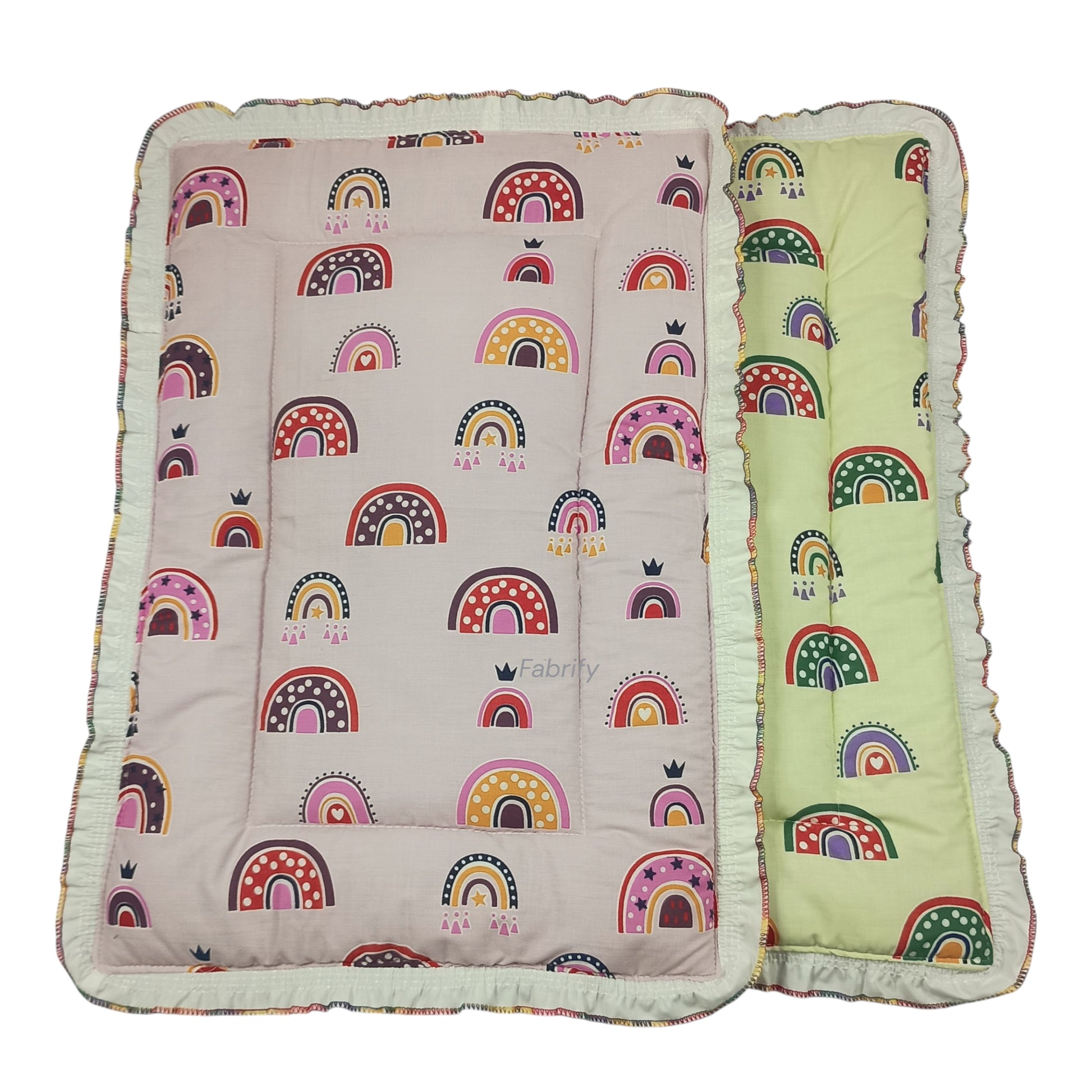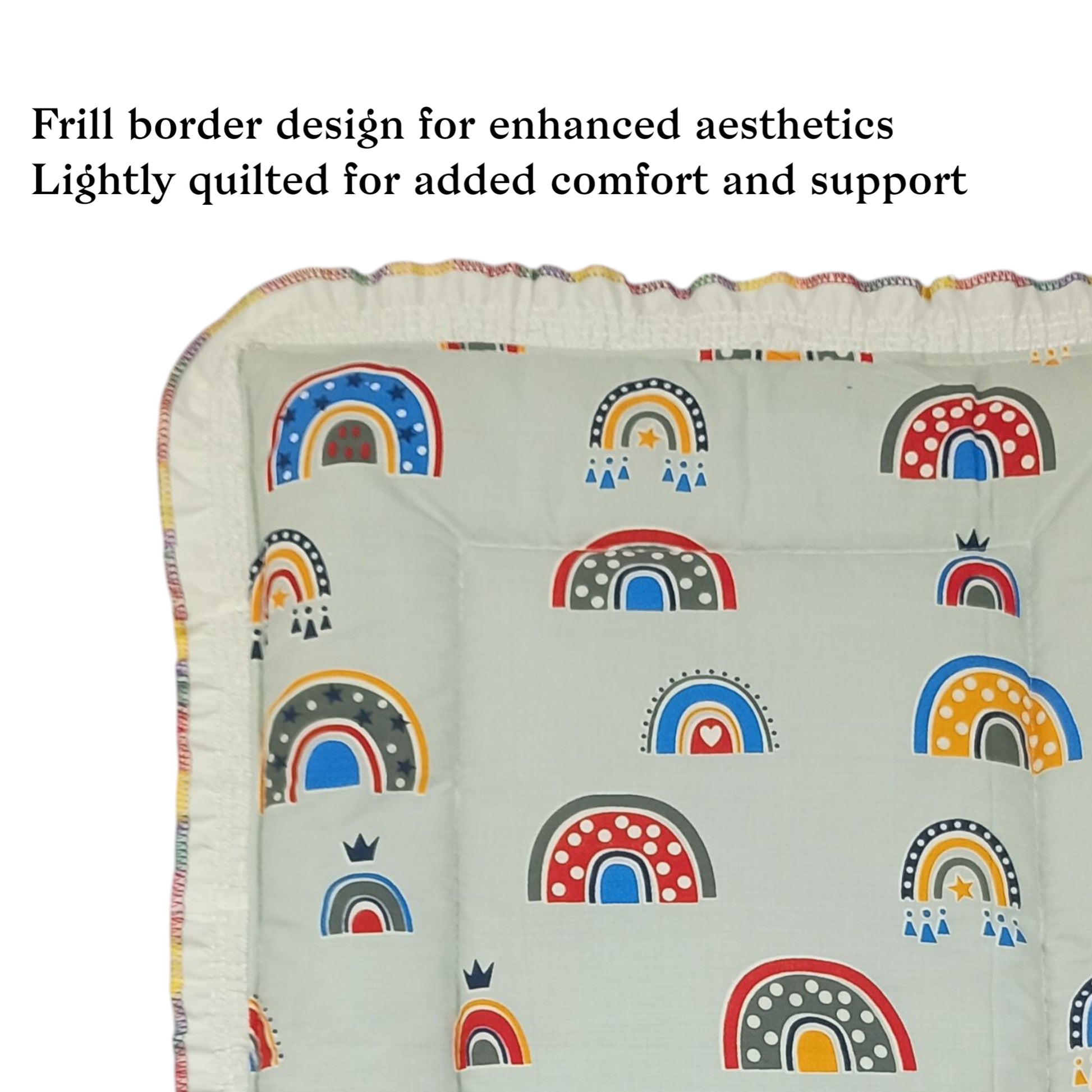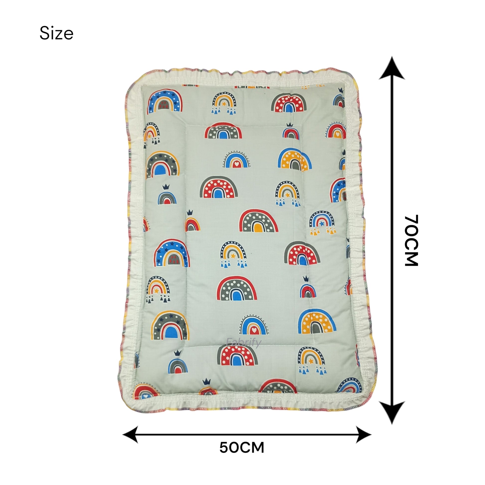 Discover Fabrify ultimate comfort for your little one with this pack of 2 super soft cotton mattress quilts. Each quilt features delightful patterns with adorable motifs including stars, clouds, animals, and charming designs perfect for a nursery. The quilts are crafted from premium cotton, ensuring breathability and softness against your baby's delicate skin. These versatile godadi quilts can be used as a mattress cover, light blanket, or bedspread, making them ideal for various seasons. The colourful bordered edges add a lovely finishing touch to each piece. The random design pack offers variety while maintaining consistent quality and comfort. These quilts are easy to maintain and become softer with each wash. Perfect for cribs, cradles, or as a cosy floor spread during tummy time. The lightweight construction allows for easy folding and storage when not in use. Please note that actual patterns may vary from the images shown. fully washable, and reusable, this newborn baby bedding set is designed for convenience and long-lasting comfort. A perfect addition to your newborn baby set, ensuring a cozy and hygienic sleep environment for your little one.The baby mat is made from a quick-drying material for added convenience. Perfect as a bed for newborn babies or a godadi for newborn baby, ensuring comfort and hygiene at all times.