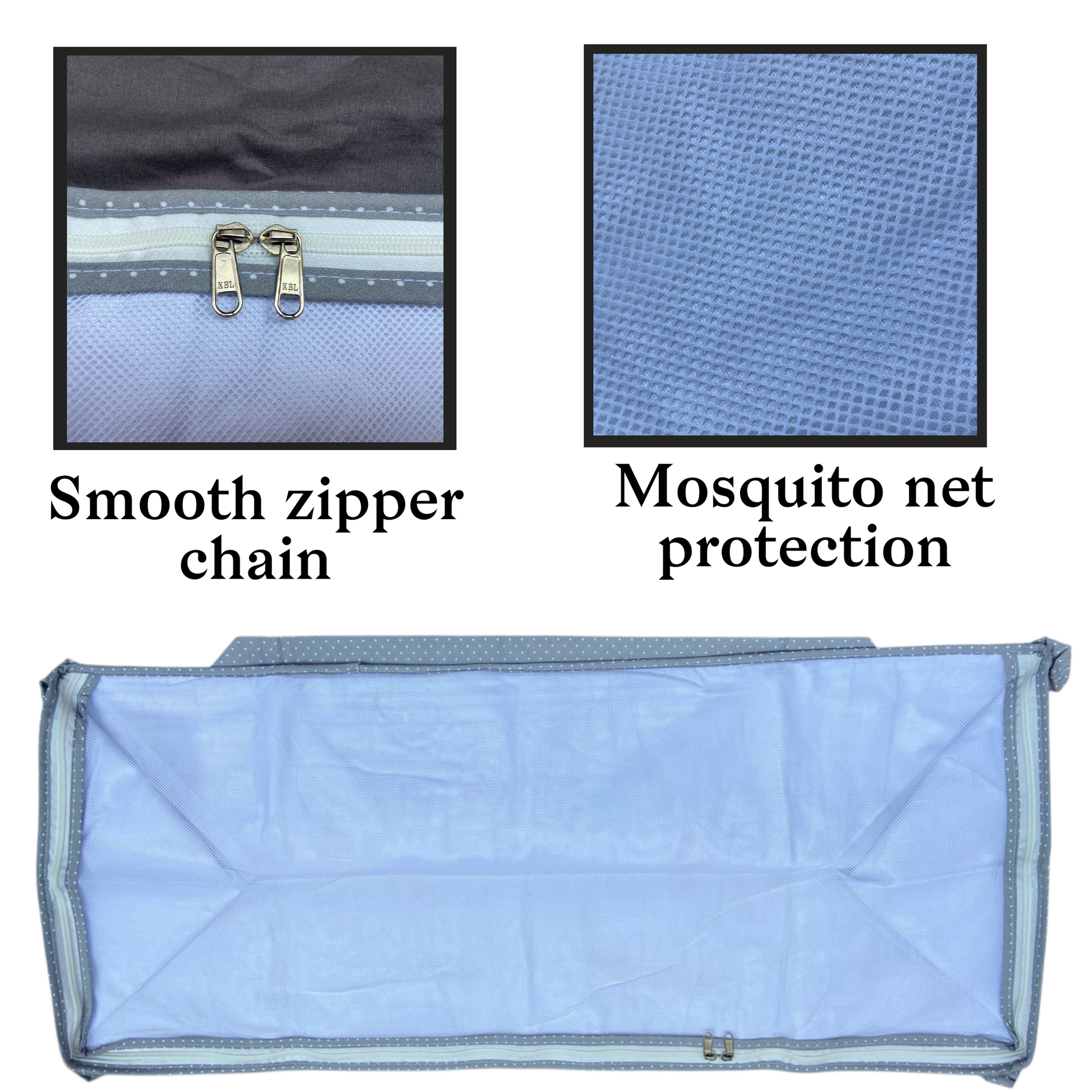 Fabrify presents comfortable cotton cradle cover. Mosquito net with zip closure protects babies from mosquito bites and insects. Strong fabric hooks helps to mount the cover on the cradle stand easily. The cover folds for storage and is easy to wash.