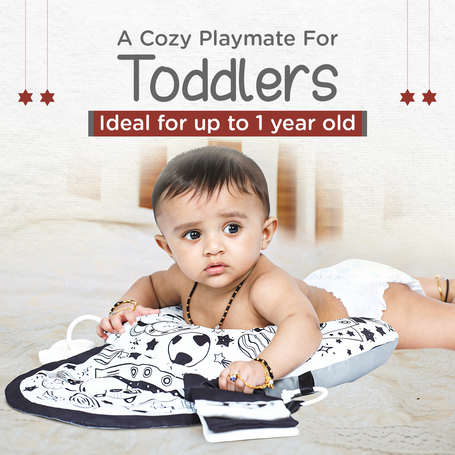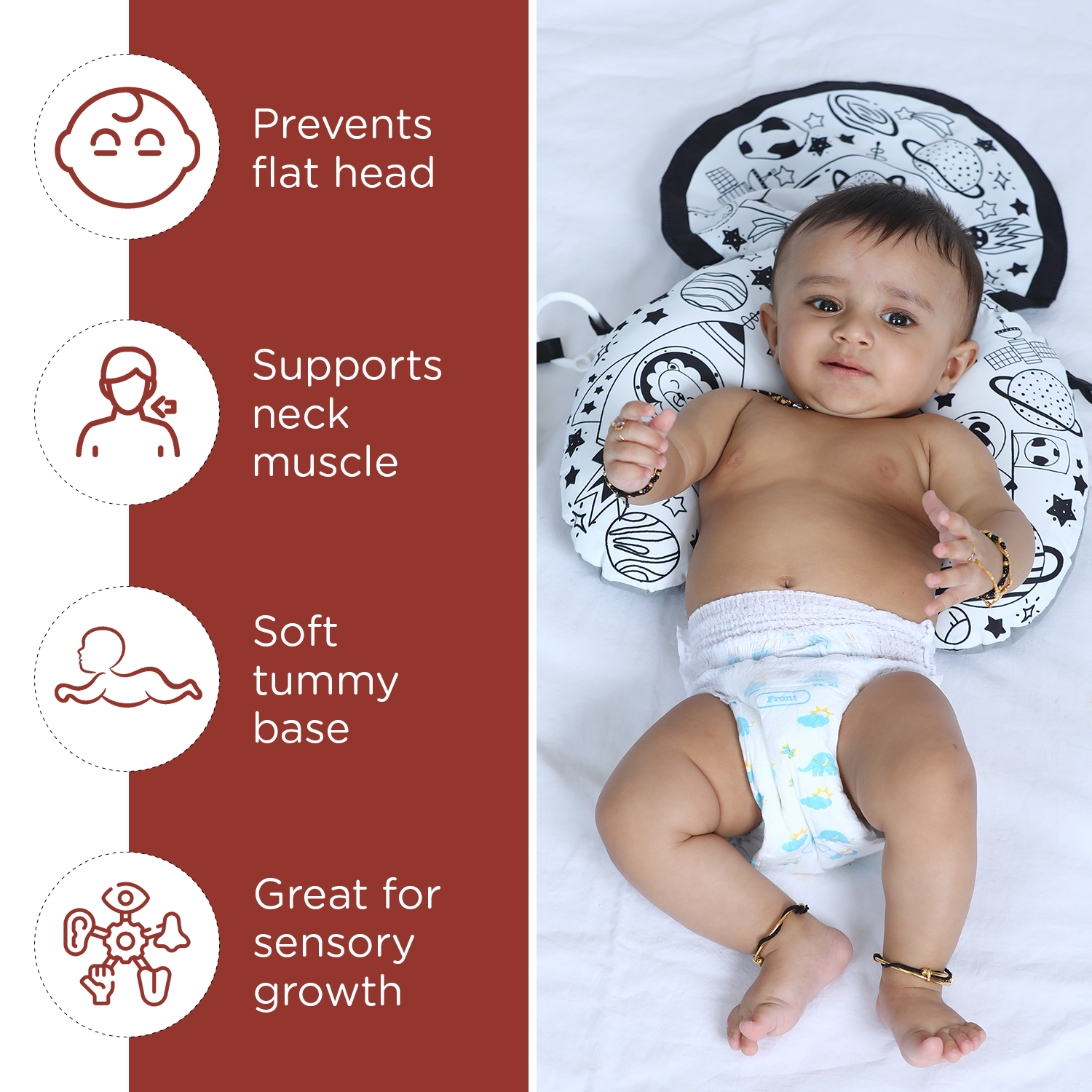 This thoughtfully designed set includes a soft ergonomic pillow, a high-contrast crinkle mat, and built-in textured teethers to give your little one a fun and enriching play experience during tummy time sessions.