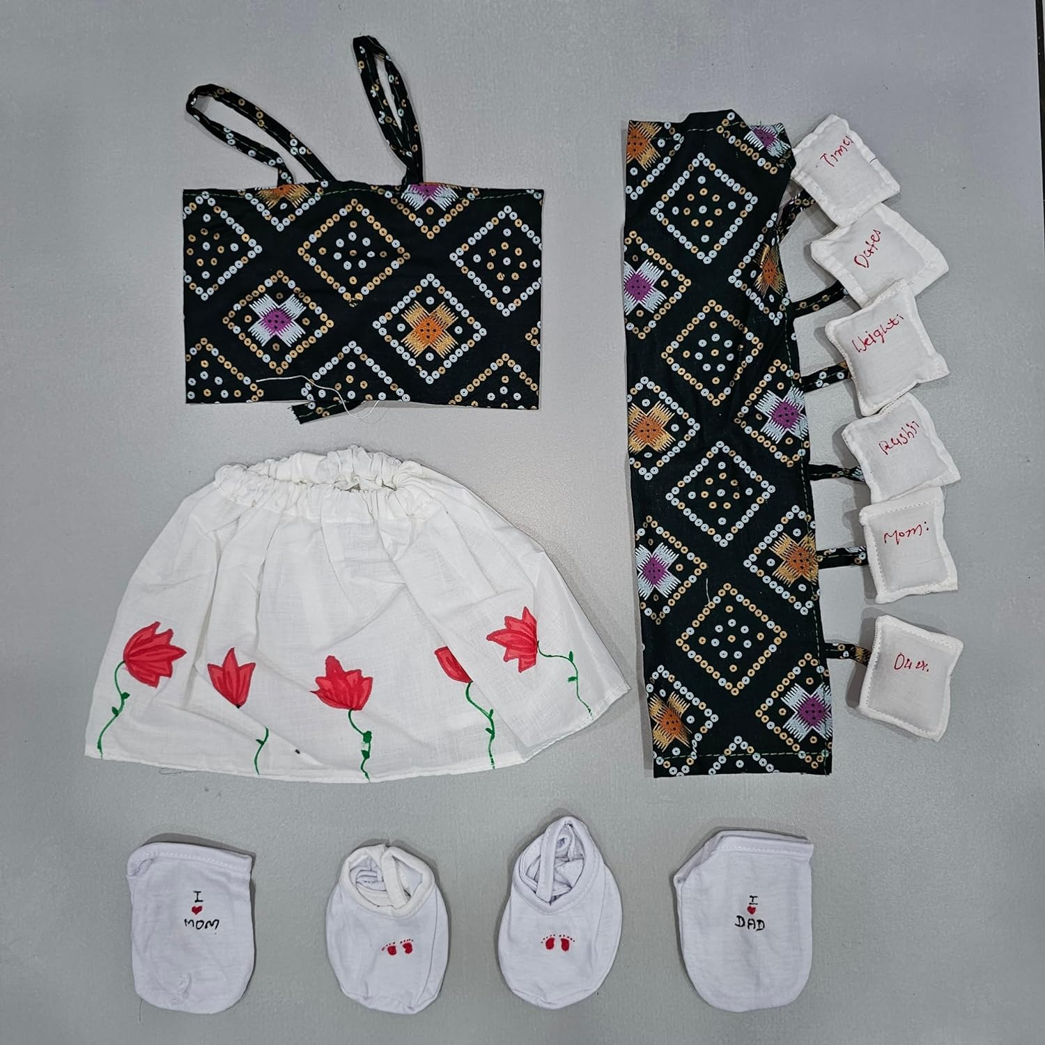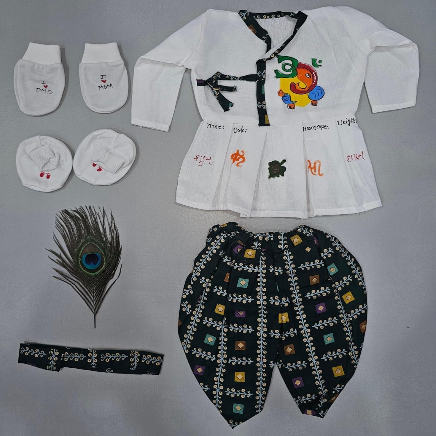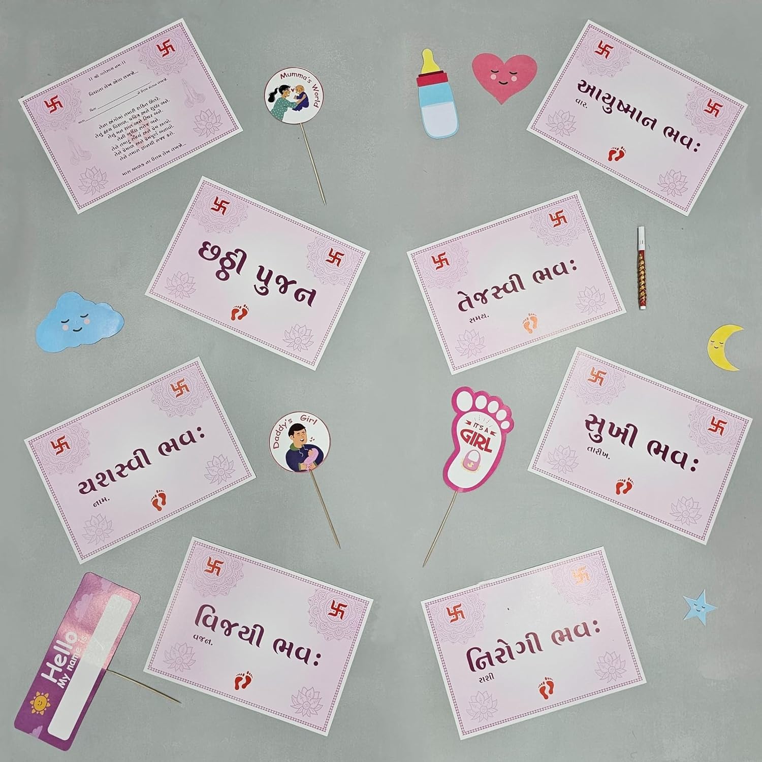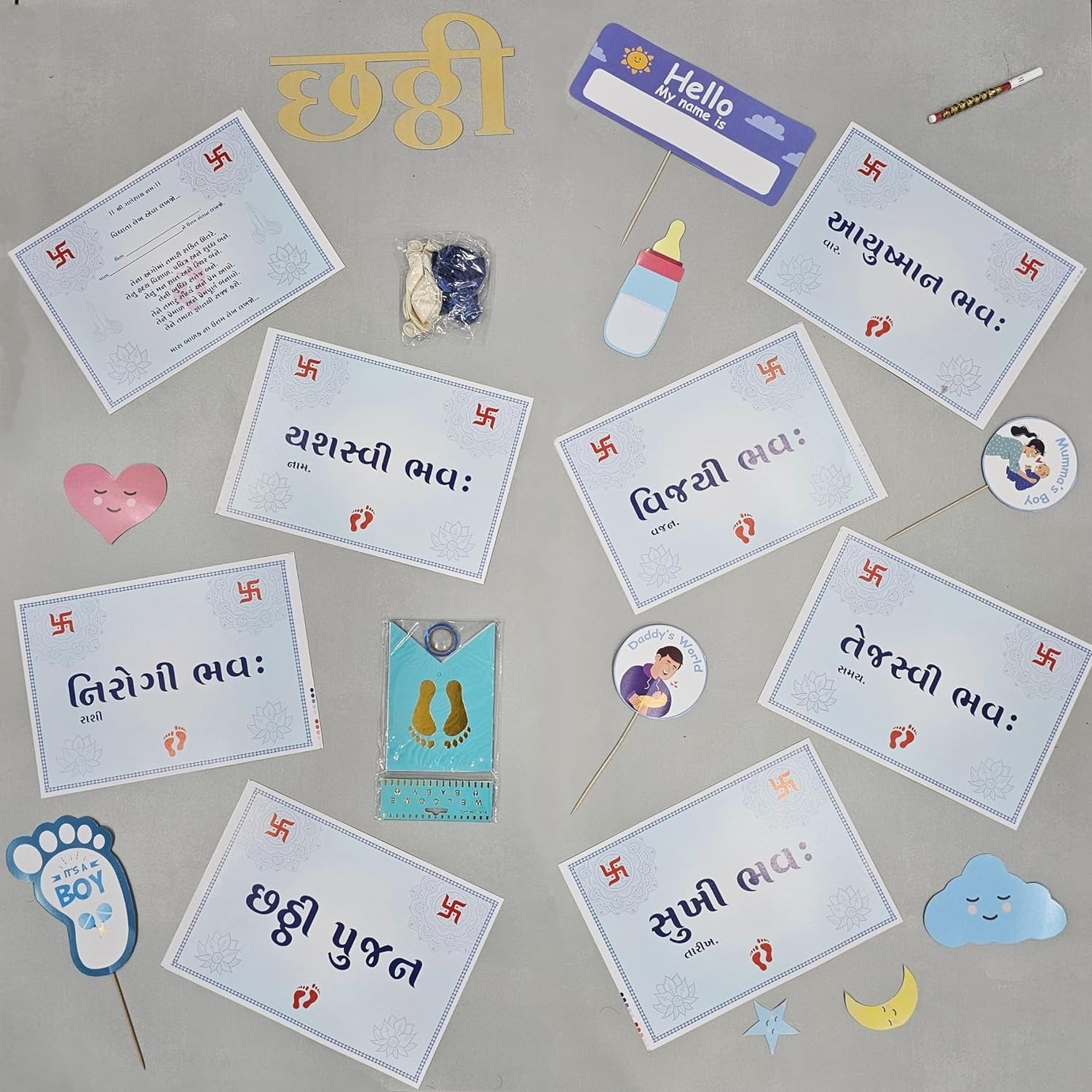 All in one day celebration kit which includes baby clothes full set blessing cards with other book balloons welcome baby handing decorative stickers, sketch pen, this product include more then 20 items.